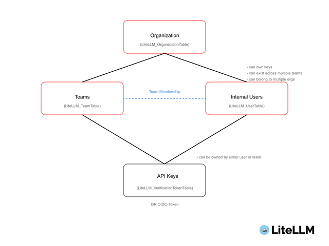 LiteLLM implements a hierarchical multi-tenant architecture with four levels: